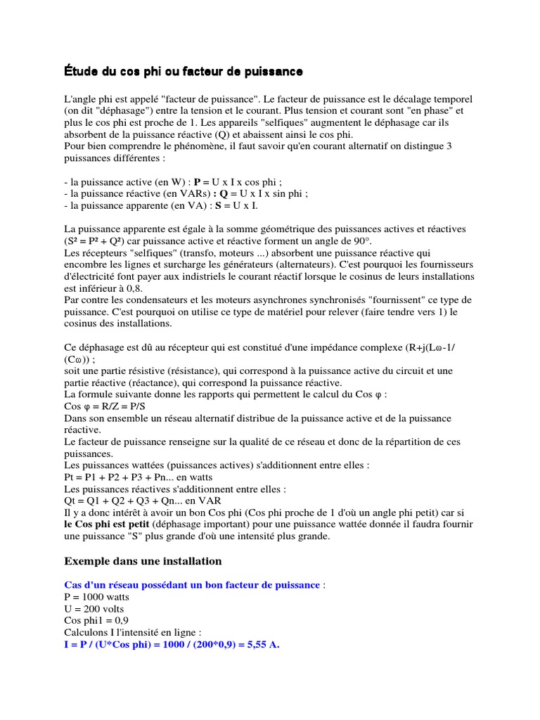 La formule est P 3 x U x I x cos φ x η cos φ x η 75 3 x U x I 0487 arrondi à 049 voir la formule folio 13 page 17 Puissance fournie par le moteur en triphasé httpwwwbts-electrotechniquefrIMG. Stel de cos phi van een apparaat is 085 en het aantal verbruikte Watts is 2300 bij 230V netspanning. MS-Word MS-Excel MS-Power Point.